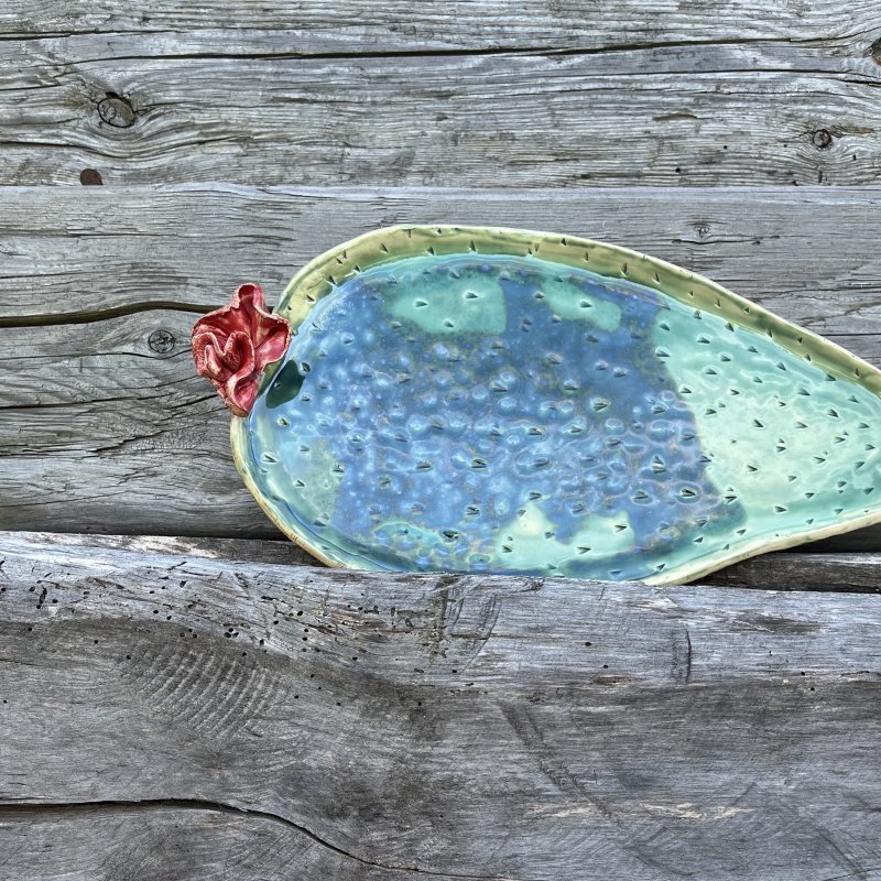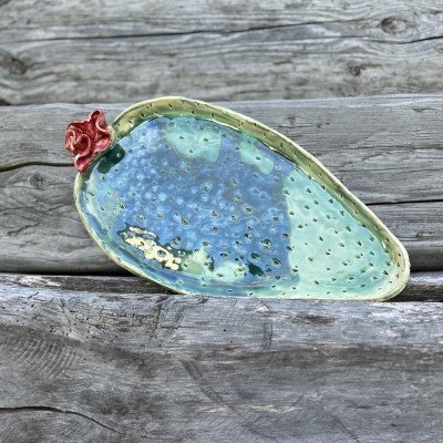 Ręcznie wykonana patera ceramiczna w kształcie kaktusa to wyjątkowy element dekoracyjny i użytkowy w jednym. Naczynie zostało uformowane z gliny, następnie wypalone w piecu ceramicznym i pokryte efektownymi szkliwami w intensywnych kolorach – zieleni oraz czerwieni. Każdy egzemplarz jest unikalny i niepowtarzalny. Doskonale sprawdzi się na owoce, przekąski czy słodkości, a także jako oryginalna dekoracja stołu.