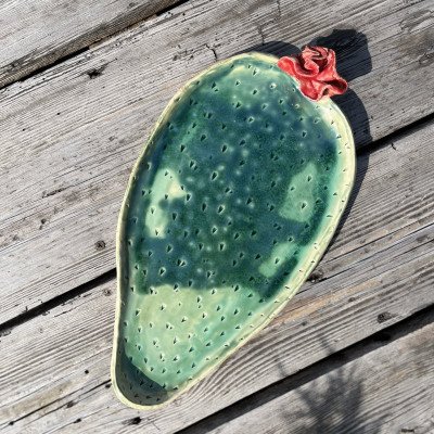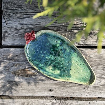Piękna patera dekoracyjna w kształcie kaktusa. Pokryta soczystym zielonym półtransparentnym szkliwem oraz błyszczącą hiszpańską czerwienią. Idealna na wyeksponowanie Twoich przekąsek na drugie śniadanie :-)