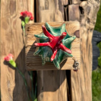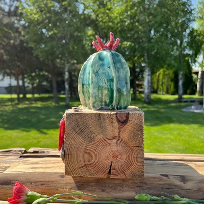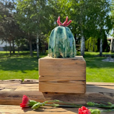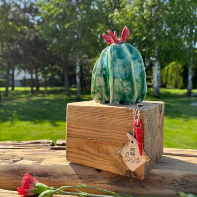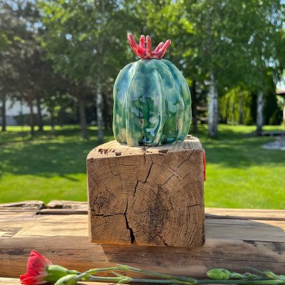 Masywna dekoracja, kaktus ceramiczny na drewnianym klocku. Kaktus ręcznie lepiony, pokryty błyszczącym szkliwem półtransparentnym zielonym. Kaktus został przyklejony do drewnianego klocka.
