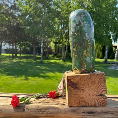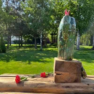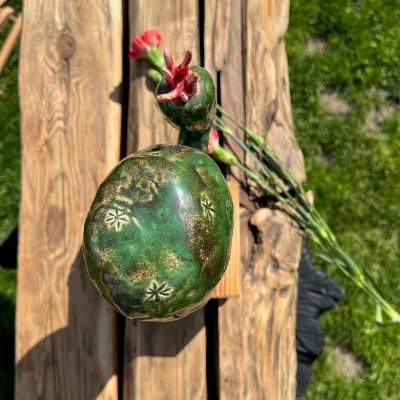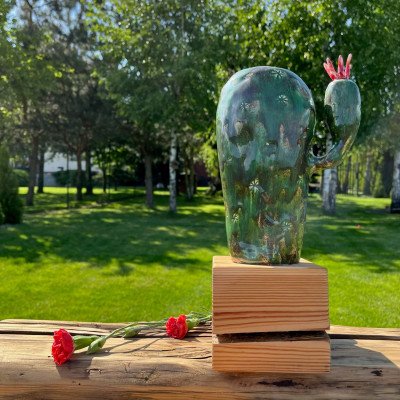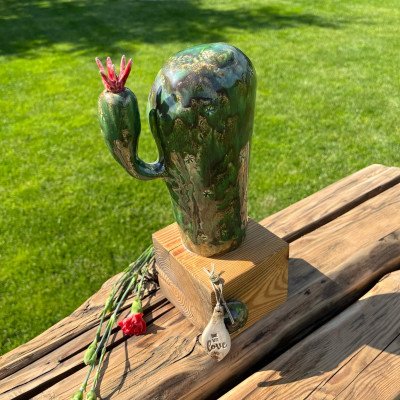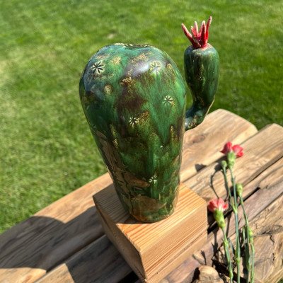 Duży, ręcznie lepiony kaktus, szkliwiony błyszczącym ciemnozielonym szkliwem z czarnymi drobinkami, usadowiony na drewnianym surowym klocku.