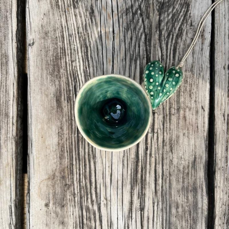 Piękny pojemnik z przykrywką połączoną z patyczkiem. Motyw liścia Monstery widoczny z boku oraz na przykrywce. Cały pojemnik pokryty błyszczącym szkliwem. Może posłużyć jako cukiernica lub pojemnik na słodkości. Szkliwo nadaje się do kontaktu z żywnością.