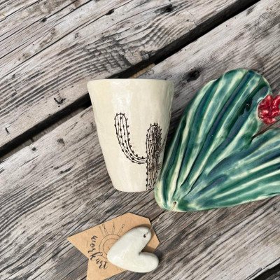 Kolejny z moich kultowych kaktusów na drewienku, nie wiem który to już w kolekcji, wiem jedno, jak wszystkie inne jest unikatowy i jedyny w swoim rodzaju. Tym razem w towarzystwie dwóch kaktusów narysowanych na kawałkach gliny, które pierwotnie miały być magnesami na lodówkę, ale ostatecznie zmieniłam ich funkcję, uznałam, że będą świetnie pasowały do tego drewnianego klocka.