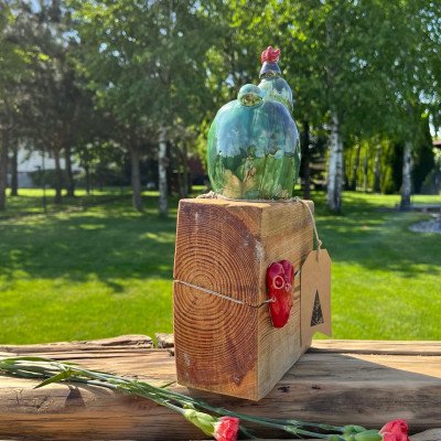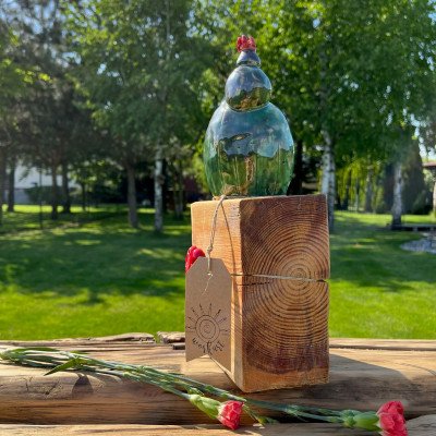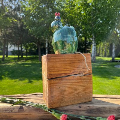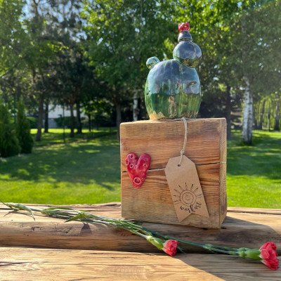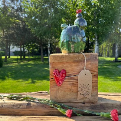 Niebanalna dekoracja, kaktus ceramiczny na drewnianym, masywnym klocku. Kaktus ręcznie lepiony, pokryty błyszczącym szkliwem zielono turkusowym z czarnym efektem. Kaktus został przyklejony do drewnianego klocka. Dodatkowa dekoracja w postaci serduszka również została wykonana ręcznie z ceramiki, szkliwo błyszczące, czerwone, przywiązane lnianymi nićmi.