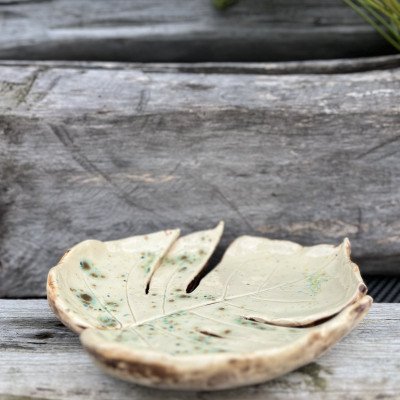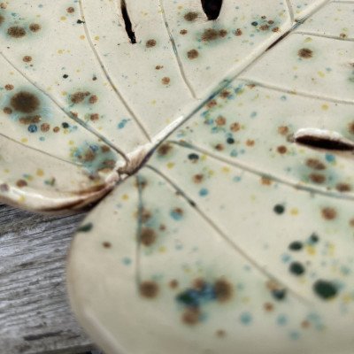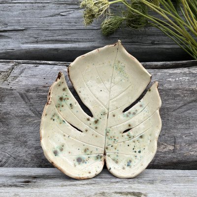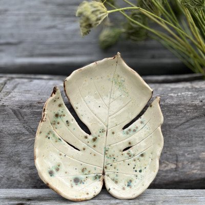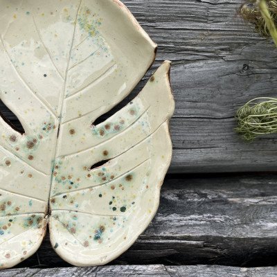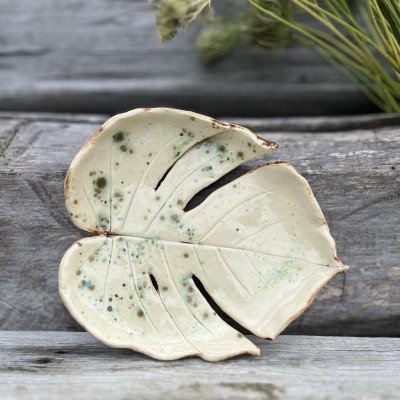 Piękny talerzyk dekoracyjny w kształcie liścia monstery. Pokryty beżowym, błyszczącym szkliwem z małymi kropeczkami w odcieniach brązu i turkusu. Sprawdzi się jako dekoracja na Twoim stole, podstawka pod kubek lub mydelniczka.