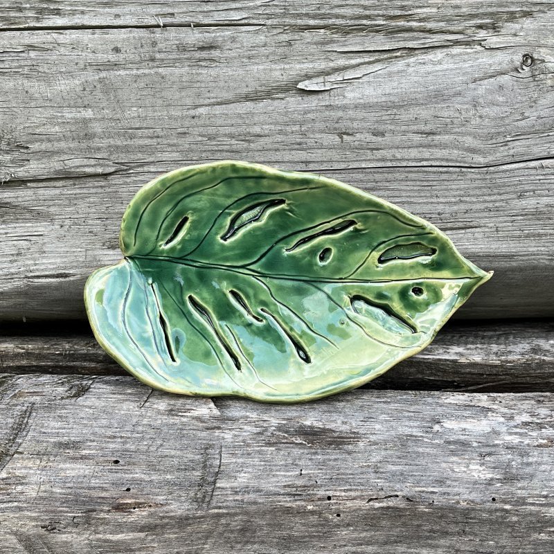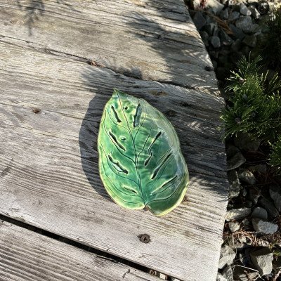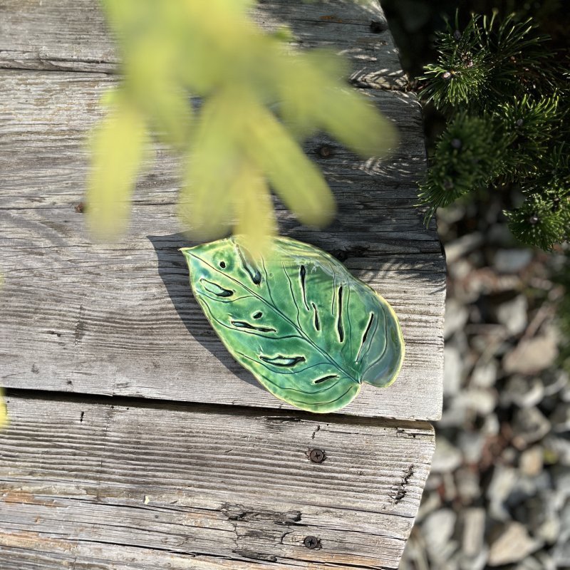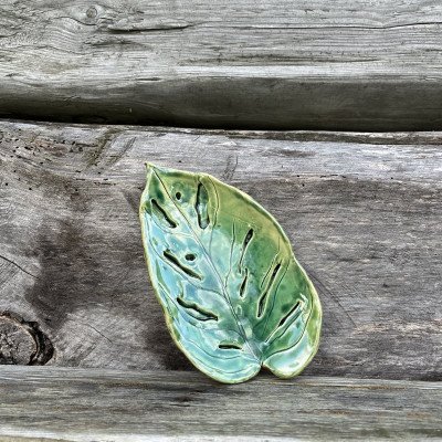 Śliczna, mała podstawka wykonana na wzór liścia monstery monkey, w pięknym odcieniu butelkowej zieleni. Świetnie sprawdzi się również jako mydelniczka lub podstawka na torebkę z herbatą.