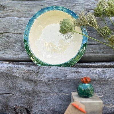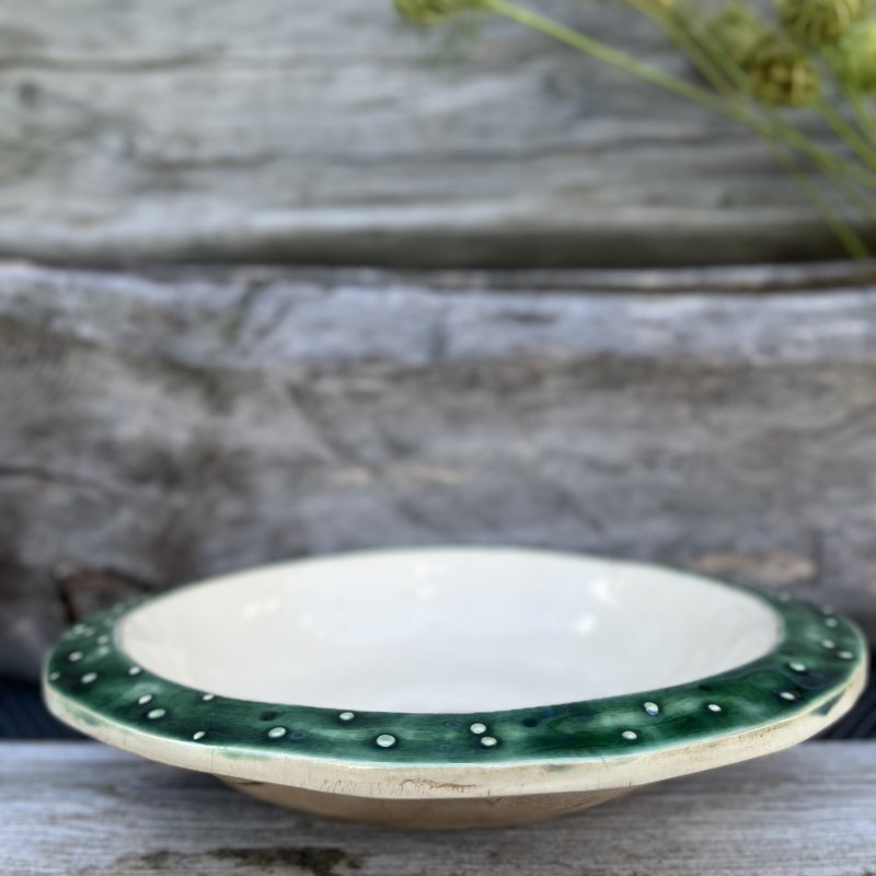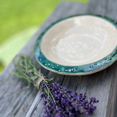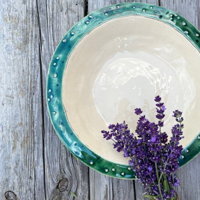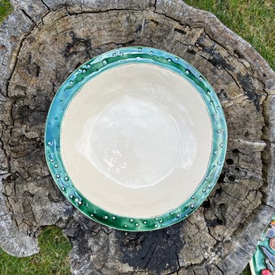Masywna, dekoracyjna patera, ręcznie wycinana i formowana z białej gliny. Idealna ozdoba stołu. Możesz ułożyć na niej owoce, szkliwo, jak wszystkie których używam, nadaje się do kontaktu z żywnością. Pokryta szkliwem turkusowo zielonym z czarnymi kropeczkami.