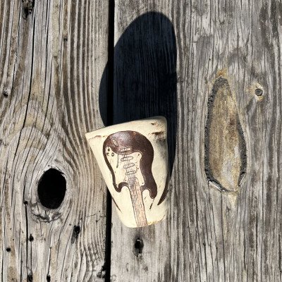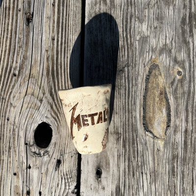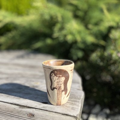 Talerze i kubeczki o nieregularnym kształcie. Szkliwo błyszczące, ciemnozielone, pótransparentne w połączeniu z delikatnym beżem.