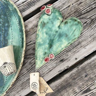 Zestaw dwóch pięknych talerzyków w kształcie kaktusa, poszkliwione pięknym zielono turkusowym szkliwem. Z takiego talerzyka każde ciasto smakuje wyjątkowo :-)