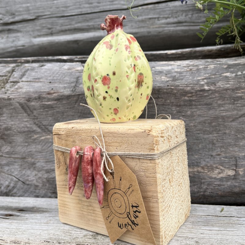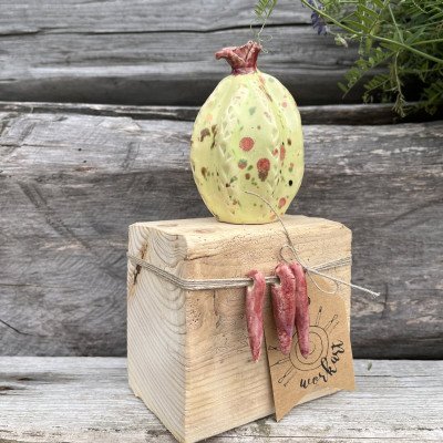 Ręcznie lepiony i ozdabiany pojemnik z motywem koralowca. Część środka została poszkliwiona zielonym morskim szkliwem z czarnym efektem, reszta pozostała w surowym stanie.