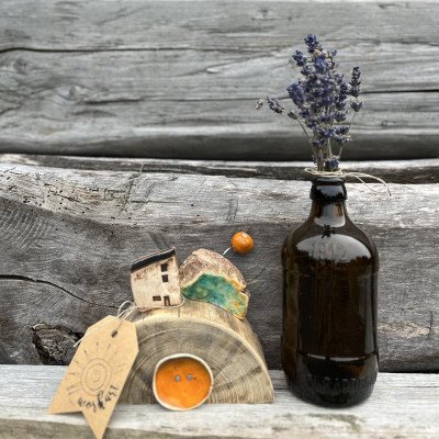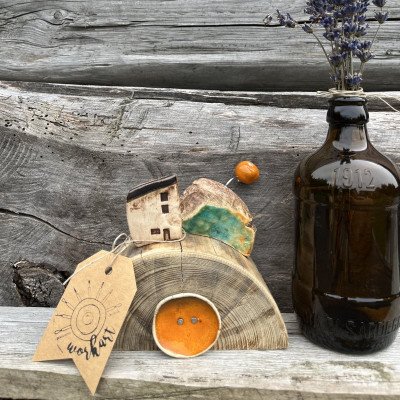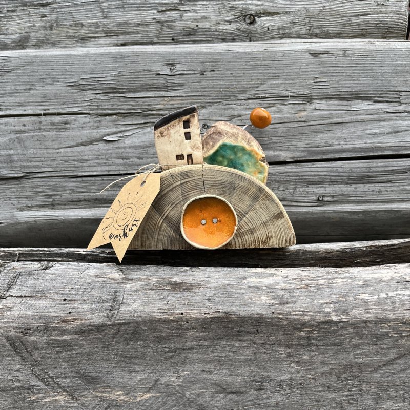 Piękna dekoracja, połączenie naturalnego drewna z ceramiką. Można ją postawić lub powiesić na ścianie.