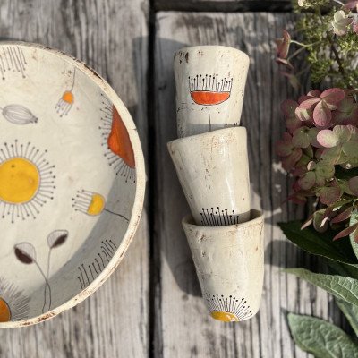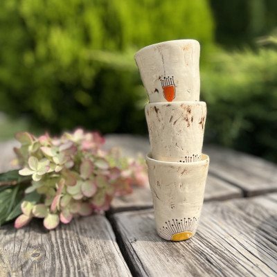 Zestaw 3 unikatowych ręcznie lepionych i ozdabianych kubeczków z kolorowymi roślinkami.