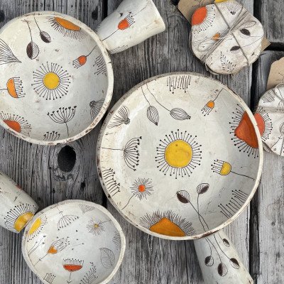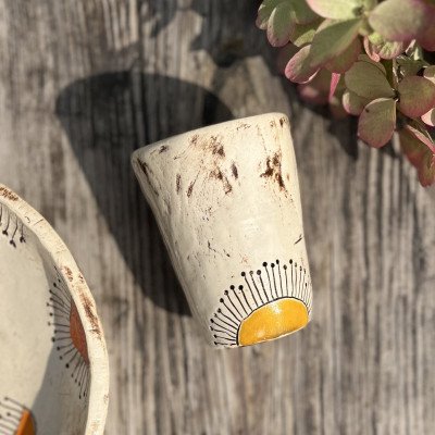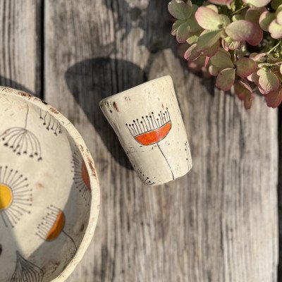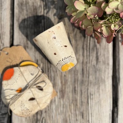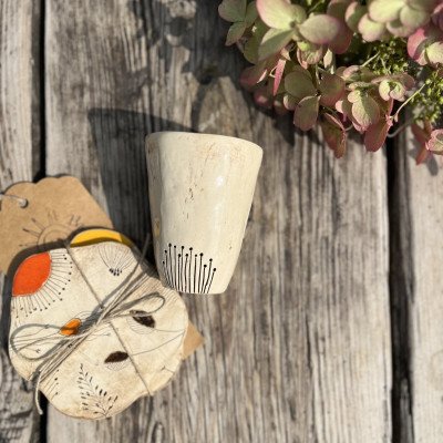 A oto 100% handmade kubeczek, który wykonałam z białej gliny. Ulepiony i ozdobiony ręcznie. Przepiękny wzór został wykonany metodą wydrapywania w suchej glinie, a następnie pokryty angobą dzięki czemu uzyskałam efekt szkicu i cieniowania. W środku został poszkliwiony błyszczącym złoto czarnym szkliwem. Z jednej strony splitowy szejpik, a z drugiej motyw kwiatowy.