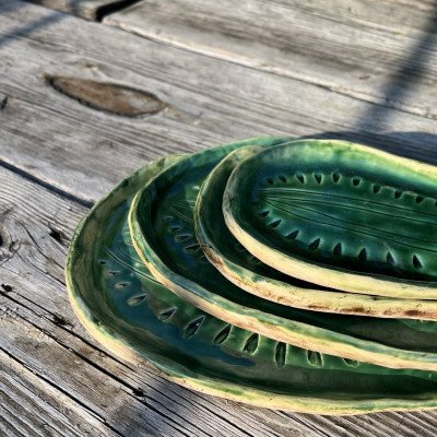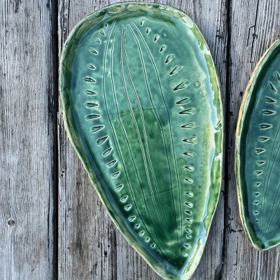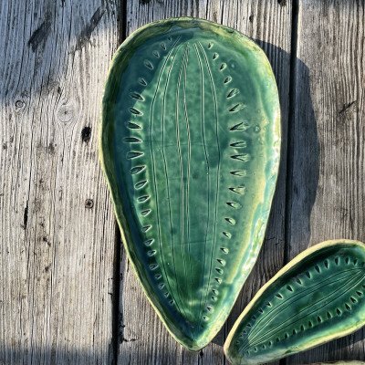 Piękna patera dekoracyjna w kształcie kaktusa. Pokryta soczystym zielonym półtransparentnym szkliwem oraz błyszczącą hiszpańską czerwienią. Idealna na wyeksponowanie Twoich przekąsek na drugie śniadanie :-)