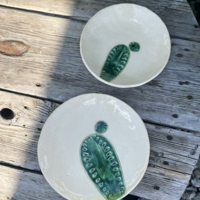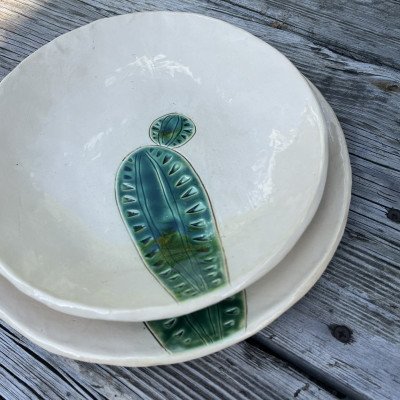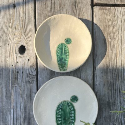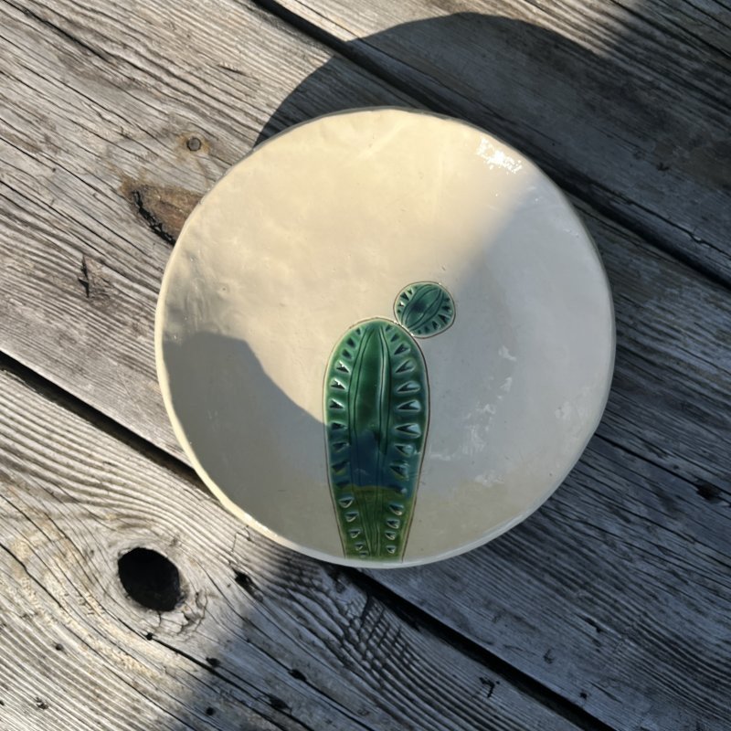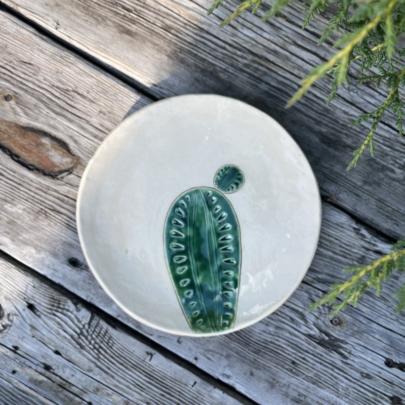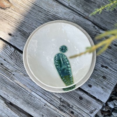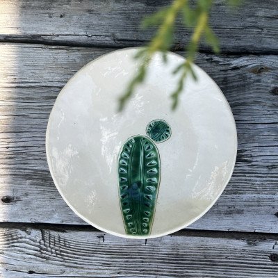 Niebanalna dekoracja, kaktus ceramiczny na drewnianym, masywnym klocku. Kaktus ręcznie lepiony, pokryty błyszczącym szkliwem zielono turkusowym z czarnym efektem. Kaktus został przyklejony do drewnianego klocka. Dodatkowa dekoracja w postaci serduszka również została wykonana ręcznie z ceramiki, szkliwo błyszczące, czerwone, przywiązane lnianymi nićmi.
