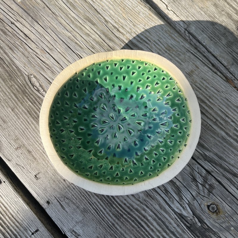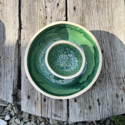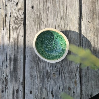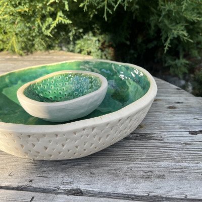 Niewielkie miseczki dekoracyjne o ciekawym kształcie. Formowane ręcznie z białej gliny. Strona zewnętrzna pozostawiona w stanie surowym, biała, matowa, środek poszkliwiony czarnym szkliwem o złotym połysku.