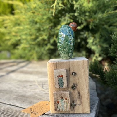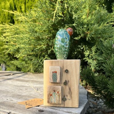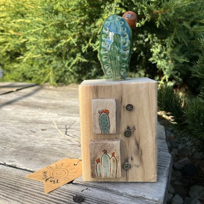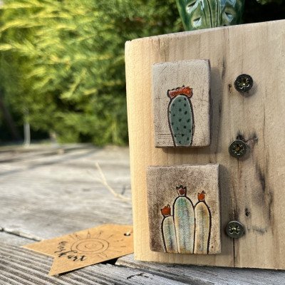 Kolejny z moich kultowych kaktusów na drewienku, nie wiem który to już w kolekcji, wiem jedno, jak wszystkie inne jest unikatowy i jedyny w swoim rodzaju. Tym razem w towarzystwie dwóch kaktusów narysowanych na kawałkach gliny, które pierwotnie miały być magnesami na lodówkę, ale ostatecznie zmieniłam ich funkcję, uznałam, że będą świetnie pasowały do tego drewnianego klocka.
