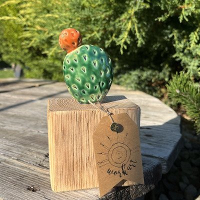Dekoracja wisząca w kształcie serca, wykonana na wzór kaktusa, piękne błyszczące, zielone szkliwo, na sznureczku doczepione małe serduszko w kolorze beżowym.