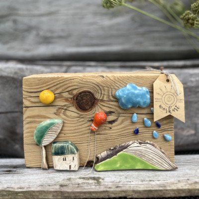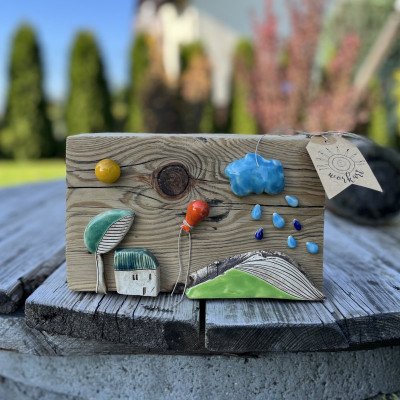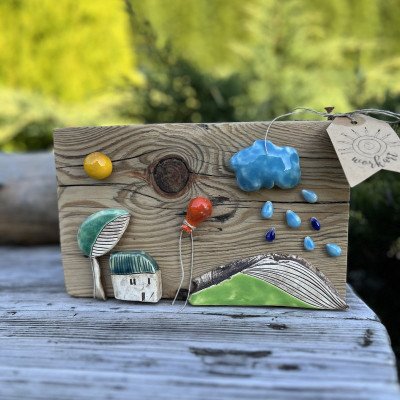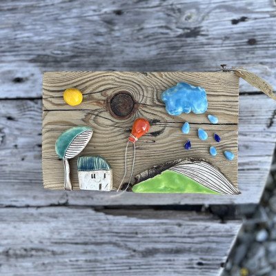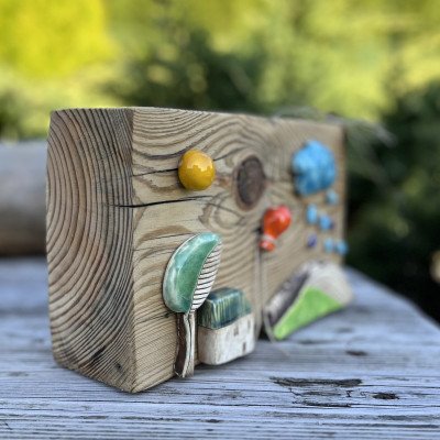 Piękna kolorowa dekoracja wykonana na dużym, masywnym klocku drewnianym. Elementy ceramiczne zostały wykonane ręcznie i przyklejone do drewna. Kompozycja do postawienia.