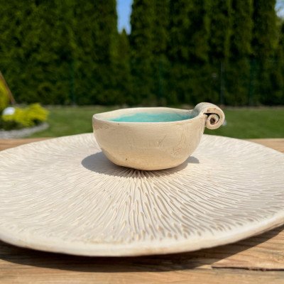 Przepiękna filiżanka na espresso. Ręcznie lepiona z białej gliny, pokryta błyszczącym szkliwem transparentnym oraz turkusowym.