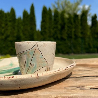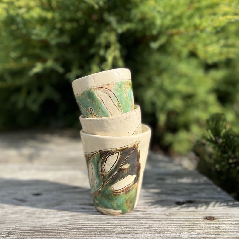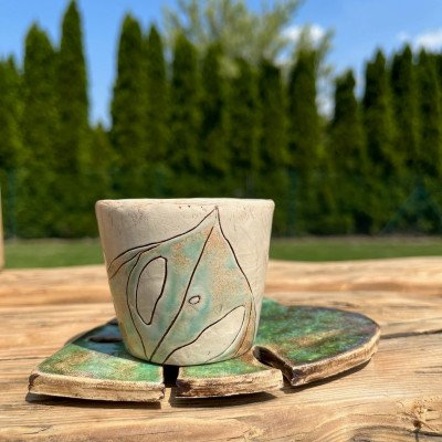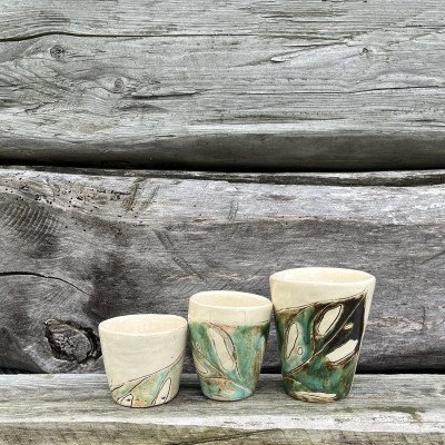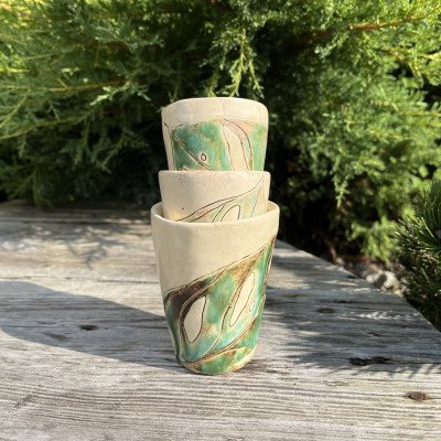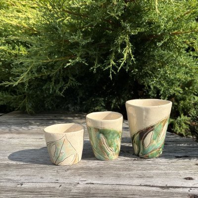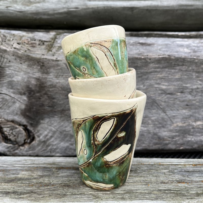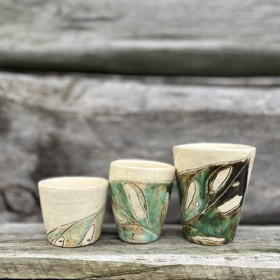 Zestaw 3 kubeczków z motywem liścia monstery.