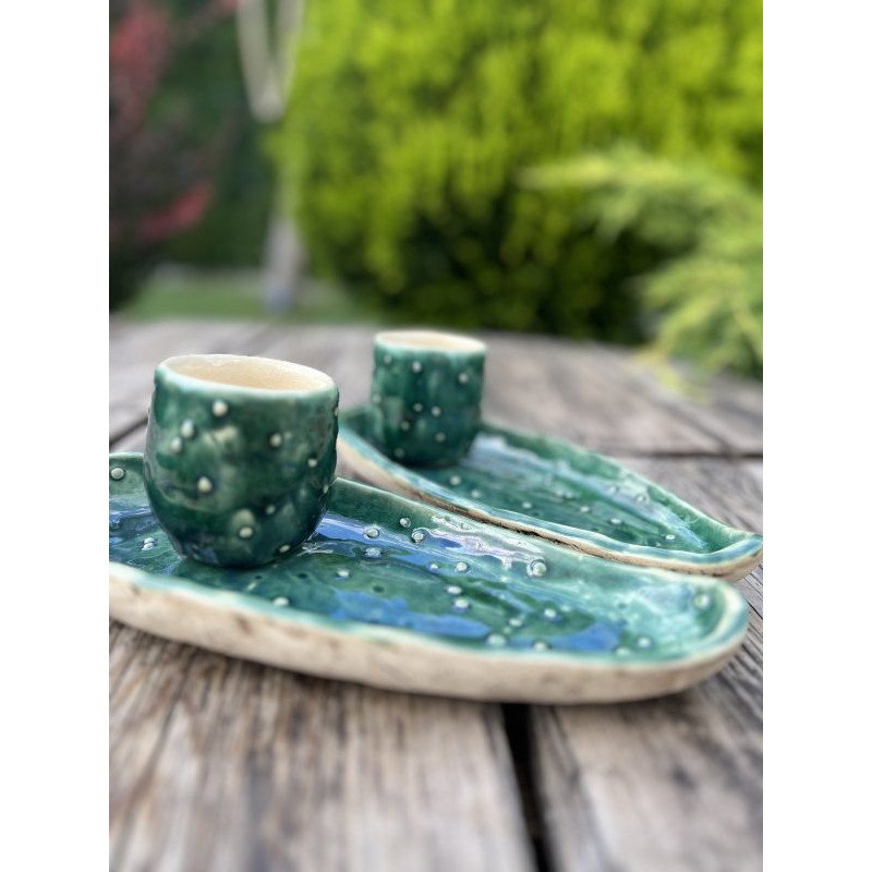 Talerze i kubeczki o nieregularnym kształcie. Szkliwo błyszczące, ciemnozielone, pótransparentne w połączeniu z delikatnym beżem.